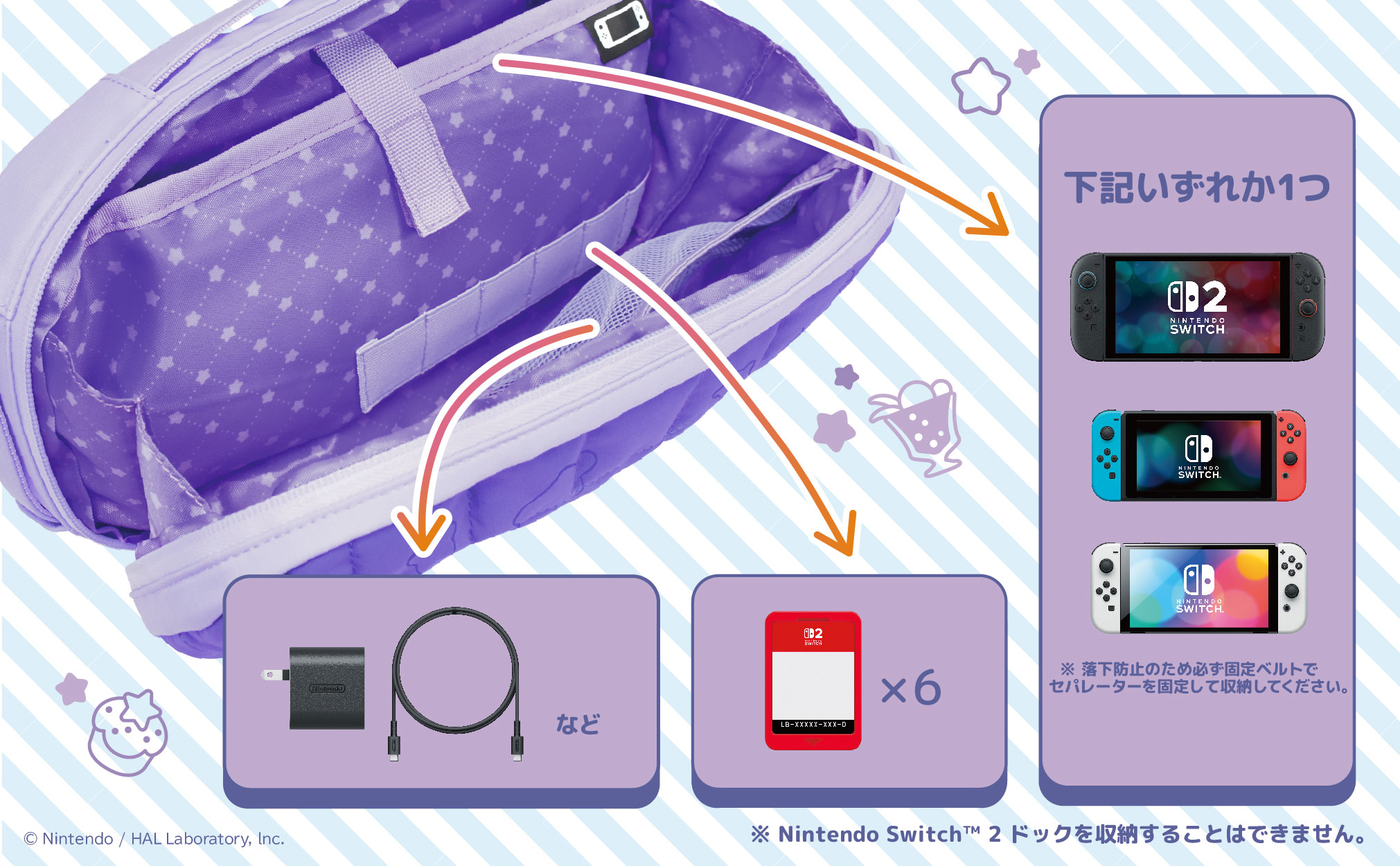 Nintendo Switch 2 本体とゲームカード6個、小物類をまとめて収納できる、 仲良しなカービィとワドルディがあしらわれた、ふんわり軽やかデザインのポーチです。販売価格:¥4,480